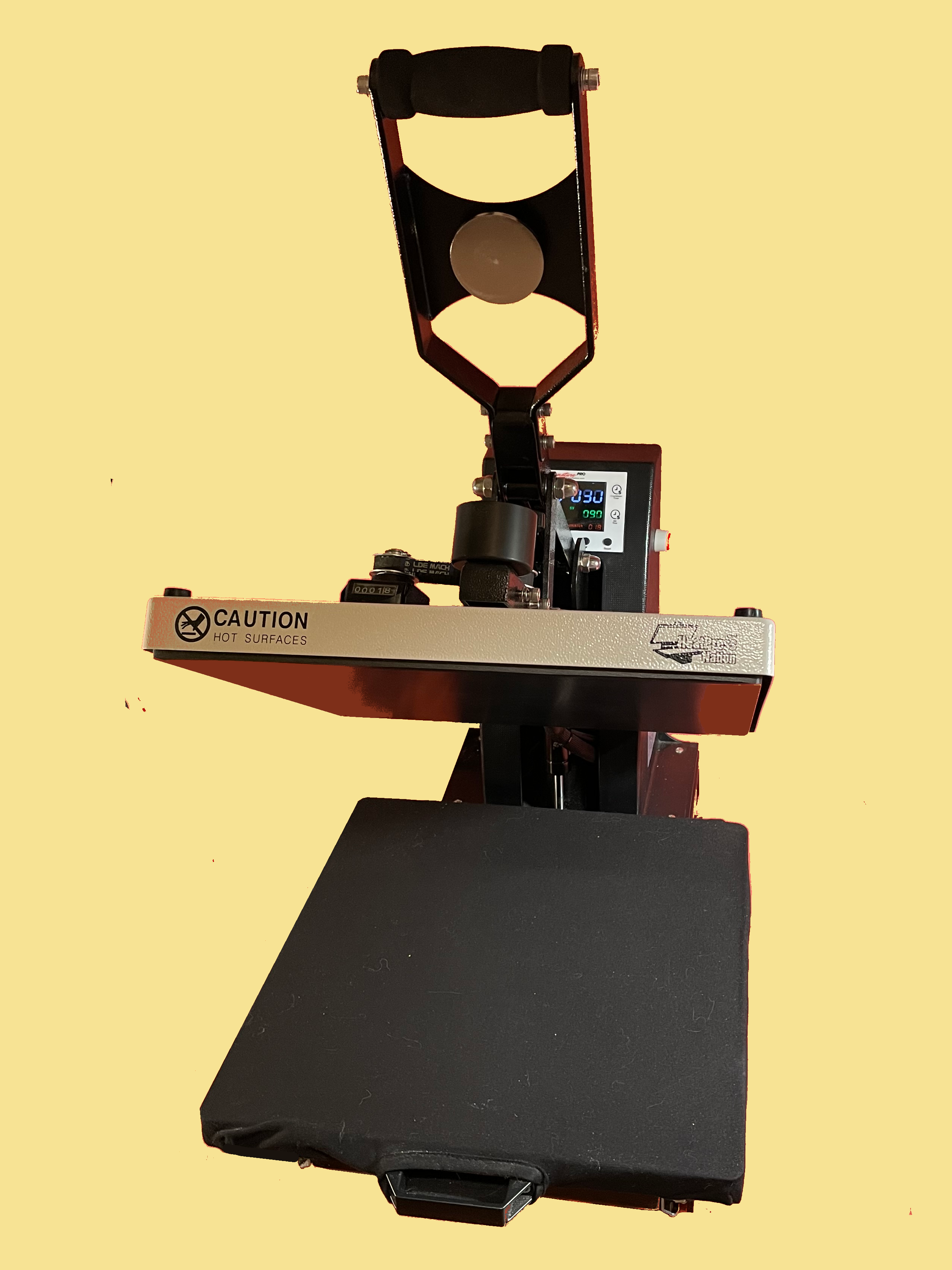 Heat press. Adjustable by temperature, time, and pressure to effect a specific final cure ... .